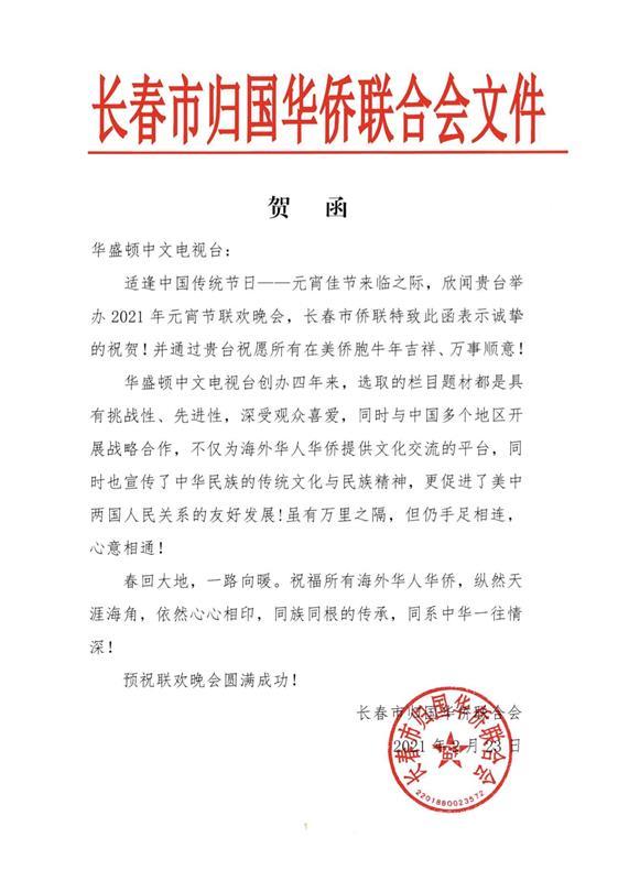 *中国长春市侨联贺信