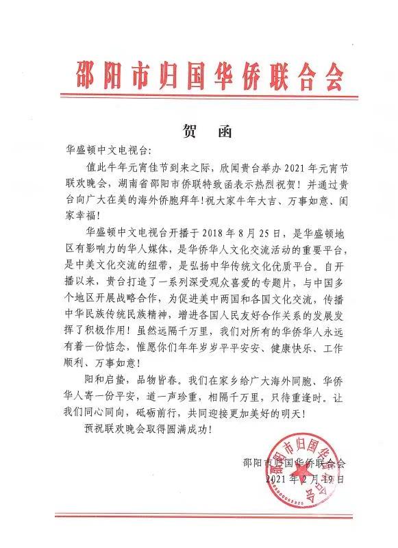 *中国邵阳市侨联贺信