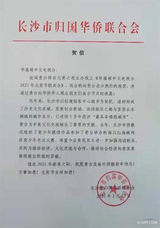 *中国长沙市侨联贺信